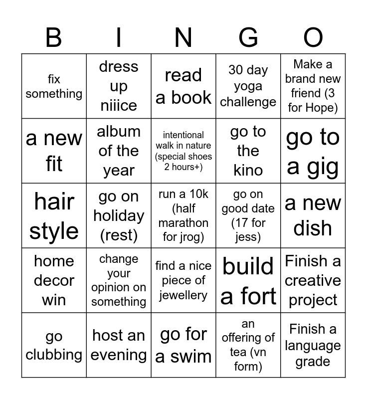This bingo card has a free space and 24 words: change your opinion on something, host an evening, intentional walk in nature (special shoes 2 hours+), go clubbing, Make a brand new friend (3 for Hope), fix something, a new fit, dress up niiice, go on good date (17 for jess), find a nice piece of jewellery, go to the kino, hair style, build a fort, Finish a creative project, album of the year, an offering of tea (vn form), a new dish, read a book, go to a gig, go on holiday (rest), Finish a language grade, home decor win, 30 day yoga challenge and go for a swim.