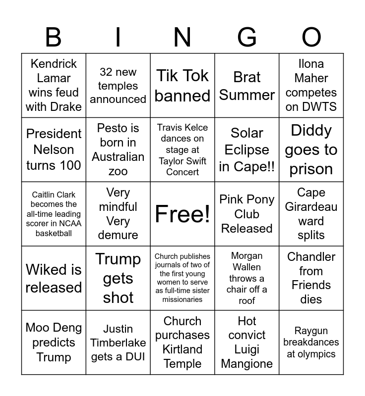 This bingo card has a free space and 24 words: Trump gets shot, Justin Timberlake gets a DUI, Travis Kelce dances on stage at Taylor Swift Concert, Moo Deng predicts Trump, Ilona Maher competes on DWTS, Kendrick Lamar wins feud with Drake, President Nelson turns 100, 32 new temples announced, Pink Pony Club Released, Church publishes journals of two of the first young women to serve as full-time sister missionaries, Solar Eclipse in Cape!!, Caitlin Clark becomes the all-time leading scorer in NCAA basketball, Morgan Wallen throws a chair off a roof, Chandler from Friends dies, Pesto is born in Australian zoo, Hot convict Luigi Mangione, Cape Girardeau ward splits, Tik Tok banned, Diddy goes to prison, Very mindful Very demure, Raygun breakdances at olympics, Wiked is released, Brat Summer and Church purchases Kirtland Temple.