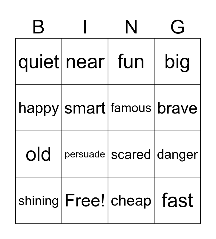 This bingo card has 24 words: ugly, creative, brave, small, happy, quiet, smart, near, Free!, hard, old, scared, strong, hot, famous, tasty, cheap, fun, persuade, danger, shining, fast, big and loud.