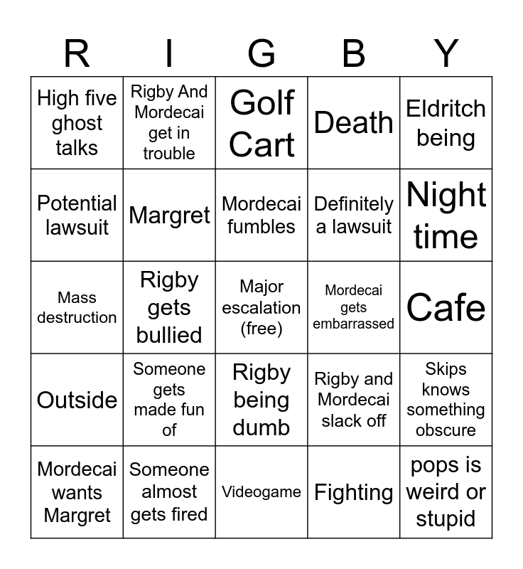 This bingo card has a free space and 45 words: Benson Yells, pops is weird or stupid, OHHHHHH, Mordecai wants Margret, Argument, Fighting, Golf Cart, My mom, Eldritch being, Someone almost gets fired, Death, Mordecai gets embarrassed, Rigby being dumb, Someone gets made fun of, Rigby abuse, Videogame, Computer, Mass destruction, Something goes wrong, Night time, Rigby And Mordecai get in trouble, Benson turns red, Muscle man is weird, High five ghost talks, Benson gets outsmarted, Cafe, High five ghost high fives, Golf cart crashes, Rigby and Mordecai slack off, Outside, Part of house breaks, Skips knows something obscure, Portal, Supernatural occurrence, Skips says "This is bad", Rigby gets bullied, Rigby says hmm hmm, Muscle Man squeals (EIEIEIEEE), Eileen, Mordecai fumbles, Potential lawsuit, Definitely a lawsuit, Benson crashes out, Margret and Rigby says "I can fix this".