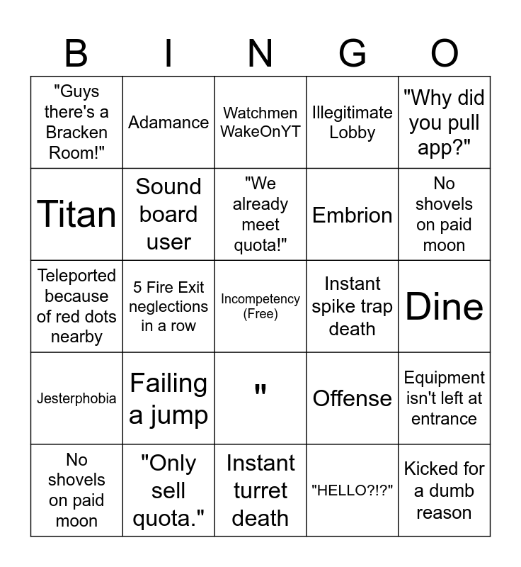 This bingo card has a free space and 26 words: ", "HELLO?!?", "We already meet quota!", "Only sell quota.", "Why did you pull app?", "Guys there's a Bracken Room!", Titan, Adamance, Dine, Offense, Embrion, Teleported because of red dots nearby, Equipment isn't left at entrance, No shovels on paid moon, 5 Fire Exit neglections in a row, Cheater, Illegitimate Lobby, Jesterphobia, Watchmen WakeOnYT, Kicked for a dumb reason, No shovels on paid moon, Instant turret death, Instant spike trap death, Failing a jump, Sound board user and Kicked for buying something.