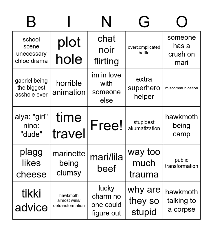 This bingo card has a free space and 24 words: marinette being clumsy, hawkmoth almost wins/ detransformation, im in love with someone else, tikki advice, someone has a crush on mari, school scene unecessary chloe drama, gabriel being the biggest asshole ever, plot hole, stupidest akumatization, mari/lila beef, extra superhero helper, alya: "girl" nino: "dude", way too much trauma, public transformation, horrible animation, why are they so stupid, hawkmoth being camp, chat noir flirting, miscommunication, time travel, hawkmoth talking to a corpse, plagg likes cheese, overcomplicated battle and lucky charm no one could figure out.