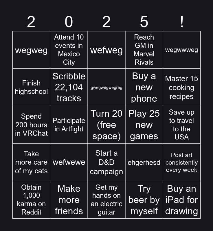 This bingo card has a free space and 34 words: Fill 60% of daily journal entries, Learn to drive a car, Reach a healthy 70kg weight, Sell NSFW art, Save up to travel to the USA, Finish highschool, Scribble 22,104 tracks, Get my hands on an electric guitar, Buy a new phone, Buy an iPad for drawing, Spend 200 hours in VRChat, Attend 10 events in Mexico City, Try beer by myself, Learn conversing in German, Take more care of my cats, Participate in Artfight, Start a D&D campaign, Play 25 new games, Post art consistently every week, Obtain 1,000 karma on Reddit, Make more friends, Go to the gym, Reach GM in Marvel Rivals, Master 15 cooking recipes, rqrfqwr, wefwewe, wefweg, fewweg, wegwwweg, wegweg, wegwe, gwegwegwegreg, ehgerhesd and wwegtehdfghdr.