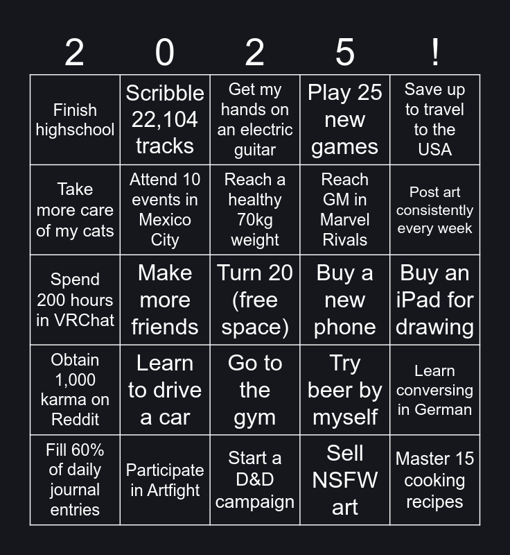This bingo card has a free space and 24 words: Fill 60% of daily journal entries, Learn to drive a car, Reach a healthy 70kg weight, Sell NSFW art, Save up to travel to the USA, Finish highschool, Scribble 22,104 tracks, Get my hands on an electric guitar, Buy a new phone, Buy an iPad for drawing, Spend 200 hours in VRChat, Attend 10 events in Mexico City, Try beer by myself, Learn conversing in German, Take more care of my cats, Participate in Artfight, Start a D&D campaign, Play 25 new games, Post art consistently every week, Obtain 1,000 karma on Reddit, Make more friends, Go to the gym, Reach GM in Marvel Rivals and Master 15 cooking recipes.