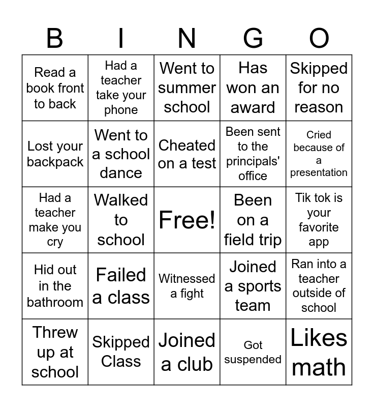 This bingo card has a free space and 24 words: Failed a class, Skipped Class, Cheated on a test, Threw up at school, Skipped for no reason, Read a book front to back, Lost your backpack, Had a teacher take your phone, Been on a field trip, Witnessed a fight, Been sent to the principals' office, Had a teacher make you cry, Joined a sports team, Ran into a teacher outside of school, Went to a school dance, Got suspended, Tik tok is your favorite app, Went to summer school, Cried because of a presentation, Walked to school, Likes math, Hid out in the bathroom, Has won an award and Joined a club.