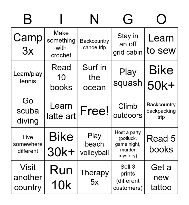 This bingo card has a free space and 24 words: Bike 30k+, Run 10k, Surf in the ocean, Visit another country, Learn to sew, Camp 3x, Learn/play tennis, Make something with crochet, Climb outdoors, Play beach volleyball, Play squash, Go scuba diving, Host a party (potluck, game night, murder mystery), Read 5 books, Read 10 books, Sell 3 prints (different customers), Backcountry backpacking trip, Backcountry canoe trip, Bike 50k+, Learn latte art, Get a new tattoo, Live somewhere different, Stay in an off grid cabin and Therapy 5x.