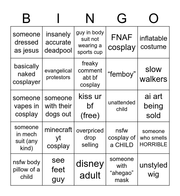 This bingo card has a free space and 24 words: minecraft yt cosplay, see feet guy, freaky comment abt bf cosplay, nsfw body pillow of a child, inflatable costume, someone dressed as jesus, basically naked cosplayer, insanely accurate deadpool, unattended child, overpriced drop selling, “femboy”, someone vapes in cosplay, nsfw cosplay of a CHILD, someone who smells HORRIBLE, evangelical protestors, someone with “ahegao” mask, ai art being sold, guy in body suit not wearing a sports cup, slow walkers, someone with their dogs out, unstyled wig, someone in mech suit (any kind), FNAF cosplay and disney adult.