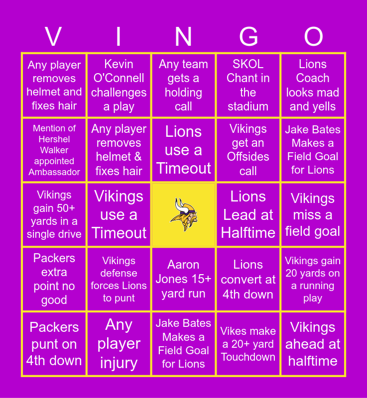 This bingo card has a free space and 113 words: Make a SKOL SISTER a drink, VIKINGS TOUCHDOWN, VIKINGS FIELD GOAL, VIKINGS Defense does a choreo dance, VIKINGS Interception, VIKINGS stop a 4th down attempt, SKOL Chant in the stadium, ANY team misses a field goal, VIKINGS covert a 4th down, Viktor shown on camera, Packers FUMBLE, VIKINGS sack Packers QB, Kevin O'Connell smiling, Justin Jefferson 20+ yard catch, Packers false start, Announcer references MN weather, Aaron Jones 15+ yard run, VIKINGS WIN, VIKINGS kicker makes extra point, Addison or JJ Touchdown, Packers punt on 4th down, Any team gets a holding call, State "I hate the Packers", Sam Darnold runs and gets a 1st down, Kevin O'Connell challenges a play, Packers extra point no good, Any player injury, Pick 6 by either team, Refs call Pass Interference, End Zone Choreographed Dance, Jake Bates Makes a Field Goal for Lions, Lions use a Timeout, Vikings use a Timeout, Any Team attempts a 2 pt. conversion, Lions Fumble, Vikings Fumble, Vikings Recover a Fumble, Jared Goff Throws a 20+ yard pass, Vikings get a Safety, Lions get a Safety, Lions Coach looks mad and yells, Prince is mentioned, Vikings Sack Lions QB, Anyone on sidelines gets hit by a player, Vikings make an Interceptions, Any player makes a one handed catch, Vikes make a 20+ yard Touchdown, Mention of Hershel Walker appointed Ambassador, Lions stop a 4th down attempt, Vikings stop a 4th down attempt, Dan Campbell challenges a play, Lions Lead at Halftime, Vikings convert at 4th down, Lions convert at 4th down, Vikings get an Offsides call, Lions get a Pass Interference call, Lions get a Holding call, Any player Injury Timeout, Lions Fans Boo after a play, Shirtless fan with body paint, Vikings gain 20 yards on a running play, Sam Darnold rushes for First Down, Crowd Chants SKOL, Vikes hard count draws Lions offsides, Justin Jefferson does the Griddy, Vikings ahead at halftime, Vikings defense forces Lions to punt, Any player removes helmet & fixes hair, Vikings gain 50+ yards in a single drive, Lions miss a field goal, Vikings miss a field goal, Kevin O'Connell challenges a play, Crowd Chants SKOL, Teddy's hard count draws Lions offsides, Justin Jefferson does the Griddy, Vikings ahead at halftime, Vikings defense forces Lions to punt, Any player removes helmet and fixes hair, Vikings gain 50+ yards in a single drive, Lions miss a field goal, Vikings miss a field goal, Kevin O'Connell challenges a play, Vikings convert at 4th down, Lions convert at 4th down, Vikings get an Offsides call, Lions get a Pass Interference call, Lions get a Holding call, Any player Injury Timeout, Lions Fans Boo after a play, Shirtless fan with body paint, Vikings gain 20 yards on a running play, Sam Darnold rushes for First Down, Lions Coach looks mad and yells, Prince is mentioned, Vikings Each Lions QB, Anyone on sidelines gets hit by a player, Will Richard makes a Field Goal, Vikings make an Interceptions, Any player makes a one handed catch, The Gjallarhorn is blown, Vikes make a 20+ yard Touchdown, Mentions of “Ambassador” Hershel Walker, Lions stop a 4th down attempt, Dan Campbell challenges a play, Lions Lead at Halftime, End Zone Choreographed Dance, Jake Bates Makes a Field Goal for Lions, Lions use a Timeout, Vikings use a Timeout, Any Team attempts a 2 pt. conversion, Lions Fumble, Vikings Recover a fumble and Jared Goff Throws a 20+ yard pass.