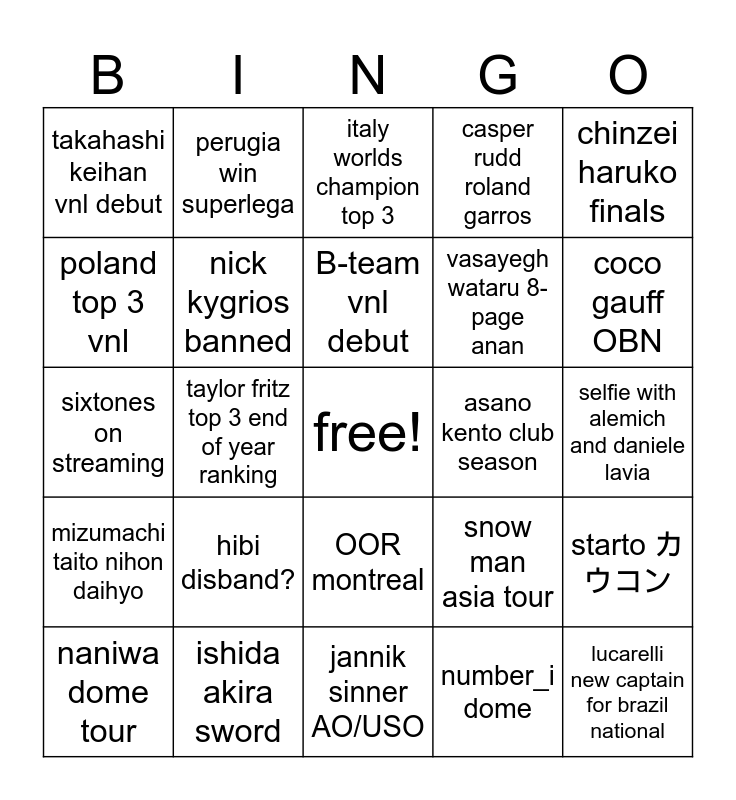 This bingo card has a free space and 24 words: hibi disband?, ishida akira sword, B-team vnl debut, naniwa dome tour, chinzei haruko finals, takahashi keihan vnl debut, poland top 3 vnl, perugia win superlega, asano kento club season, OOR montreal, vasayegh wataru 8-page anan, sixtones on streaming, snow man asia tour, starto カウコン, nick kygrios banned, number_i dome, selfie with alemich and daniele lavia, italy worlds champion top 3, coco gauff OBN, taylor fritz top 3 end of year ranking, lucarelli new captain for brazil national, mizumachi taito nihon daihyo, casper rudd roland garros and jannik sinner AO/USO.