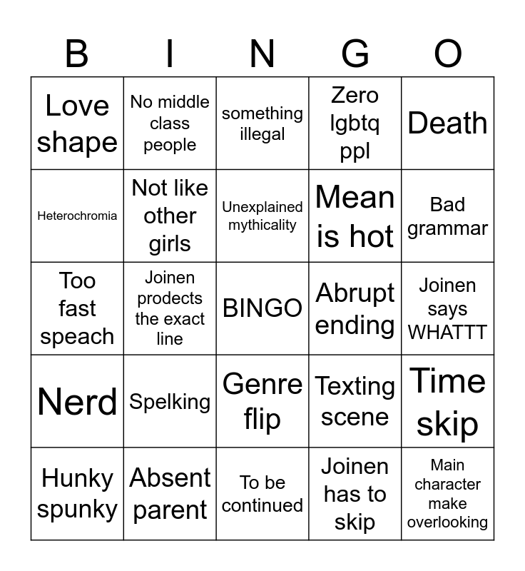 This bingo card has a free space and 24 words: Spelking, Absent parent, Unexplained mythicality, Hunky spunky, Death, Love shape, Heterochromia, No middle class people, Abrupt ending, Genre flip, Mean is hot, Too fast speach, Texting scene, Time skip, Not like other girls, Joinen has to skip, Joinen says WHATTT, something illegal, Bad grammar, Joinen prodects the exact line, Main character make overlooking, Nerd, Zero lgbtq ppl and To be continued.