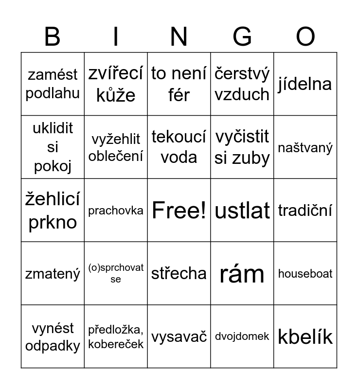 This bingo card has a free space and 84 words: Fakt!, Myslel/a jsem, že umřu., to není fér, ak nezdvořilý, čas na večeři, vyčistit sporák, uklidit ze stolu / prostřít stůl, ozdobit dort, dělat všechny domácí práce, utírat prach na poličkách, vyprázdnit/naplnit pračku, složit oblečení, vyžehlit oblečení, ustlat, uklidit oblečení, zamést podlahu, vynést odpadky, uklidit si pokoj, umýt/utřít nádobí, zalít rostliny (květiny), koště, smeták, vyčistit si zuby, kbelík, dělat úkoly, prachovka, obléknout se, vstávat (ráno), jít domů, jít spát, jít do školy, chodit do školy, (o)sprchovat se, snídat, být ve škole, žehlicí prkno, mop, sušička, vysavač, šňůra na prádlo, naštvaný, zmatený, zklamaný, v rozpacích, rozpačitý, mít (něčeho) dost, mít (něčeho) plné zuby, vyděšený, vystrašený, zkroušený, nešťastný, ustaraný, zvířecí kůže, základní, komín, elektřina, vchod, vjezd, rám, čerstvý vzduch, topení, luxus, venkovní záchod, předložka, kobereček, tekoucí voda, stan, tradiční, šatní skříň, kamna na dřevo, sporák na dřevo, bytový dům, balkon, byt v suterénu, koupelna, ložnice, samostatný domek, jídelna, hala, chodba, houseboat, kuchyně, obývací pokoj, nově postavený dům, novostavba, střecha, dvojdomek, řadový dům, toaleta, záchod, spojit, spojovat, zjistit, vést si, dát pryč, dít se and založit.