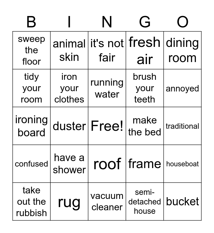 This bingo card has a free space and 84 words: Honestly!, I nearly died, it's not fair, so rude, time for dinner, clean the cooker, clear / lay the table, decorate a cake, do all the housework, dust the shelves, empty / load the washing machine, fold the clothes, iron your clothes, make the bed, put away clothes, sweep the floor, take out the rubbish, tidy your room, wash / dry the dishes, water the plants, broom, brush your teeth, bucket, do your homework, duster, get dressed, get up (in the morning), go home, go to bed, go to school, have a shower, have breakfast, have lessons, ironing board, mop, tumble dryer, vacuum cleaner, washing line, annoyed, confused, disappointed, embarrassed, fed up with, frightened, miserable, worried, animal skin, basic, chimney, electricity, entrance, frame, fresh air, heating, luxury, outhouse, rug, running water, tent, traditional, wardrobe, wood stove, apartment block, balcony, basement flat, bathroom, bedroom, detached house, dining room, hall, houseboat, kitchen, living room, new build house, roof, semi-detached house, terraced house, toilet, bring together, find out, get on, give away, go on and set up.