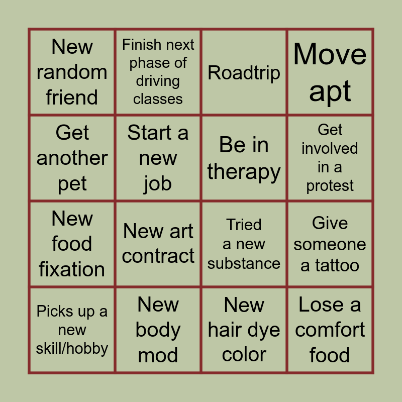 This bingo card has 16 words: Picks up a new skill/hobby, New body mod, Roadtrip, Move apt, Get another pet, Finish next phase of driving classes, Tried a new substance, Give someone a tattoo, New random friend, Start a new job, New hair dye color, Get involved in a protest, New food fixation, New art contract, Be in therapy and Lose a comfort food.