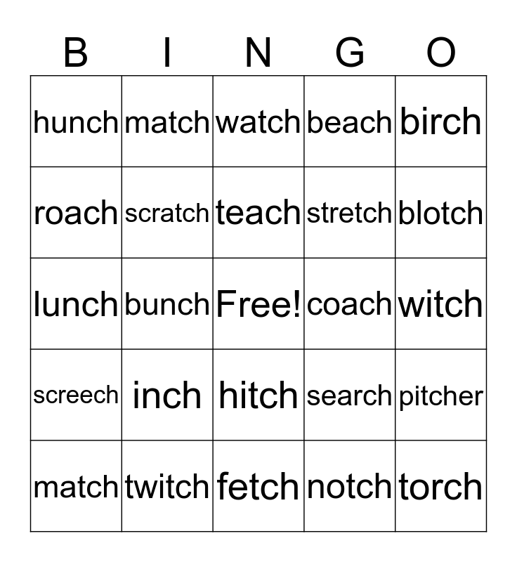 This bingo card has a free space and 24 words: inch, twitch, teach, match, birch, hunch, roach, match, coach, hitch, stretch, lunch, search, pitcher, scratch, notch, witch, watch, blotch, bunch, torch, screech, beach and fetch.