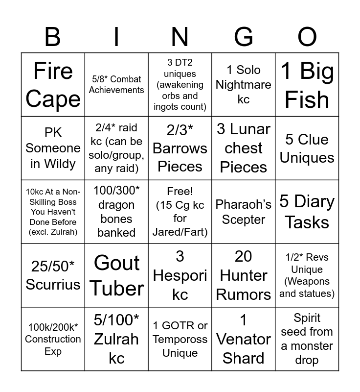 This bingo card has a free space and 24 words: Gout Tuber, 5/100* Zulrah kc, 2/3* Barrows Pieces, 100k/200k* Construction Exp, 1 Big Fish, Fire Cape, PK Someone in Wildy, 5/8* Combat Achievements, Pharaoh’s Scepter, 3 Hespori kc, 3 Lunar chest Pieces, 10kc At a Non-Skilling Boss You Haven't Done Before (excl. Zulrah), 20 Hunter Rumors, 1/2* Revs Unique (Weapons and statues), 2/4* raid kc (can be solo/group, any raid), 1 Venator Shard, 5 Diary Tasks, 3 DT2 uniques (awakening orbs and ingots count), 5 Clue Uniques, 100/300* dragon bones banked, Spirit seed from a monster drop, 25/50* Scurrius, 1 Solo Nightmare kc and 1 GOTR or Tempoross Unique.