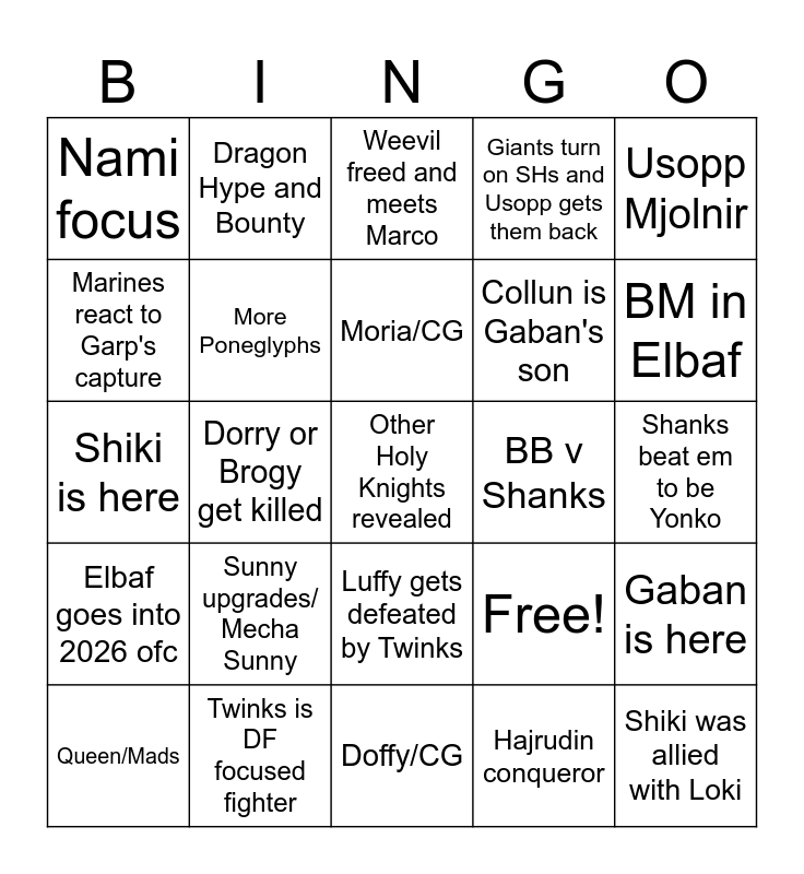 This bingo card has 25 words: Sunny upgrades/ Mecha Sunny, Doffy/CG, Moria/CG, Queen/Mads, Usopp Mjolnir, Nami focus, Marines react to Garp's capture, Dragon Hype and Bounty, BB v Shanks, Luffy gets defeated by Twinks, Collun is Gaban's son, Shiki is here, Free!, Gaban is here, More Poneglyphs, Shiki was allied with Loki, Shanks beat em to be Yonko, Weevil freed and meets Marco, BM in Elbaf, Dorry or Brogy get killed, Other Holy Knights revealed, Twinks is DF focused fighter, Elbaf goes into 2026 ofc, Giants turn on SHs and Usopp gets them back and Hajrudin conqueror.