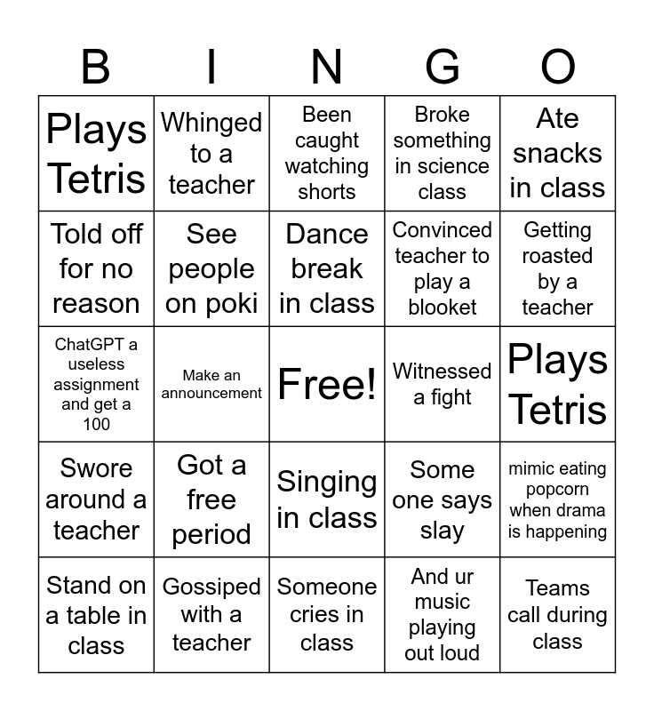 This bingo card has a free space and 26 words: Singing in class, And ur music playing out loud, Dance break in class, Gossiped with a teacher, Ate snacks in class, Plays Tetris, Told off for no reason, Whinged to a teacher, Plays Tetris, Some one says slay, Convinced teacher to play a blooket, ChatGPT a useless assignment and get a 100, mimic eating popcorn when drama is happening, Stand on a table in class, Make an announcement, Got absolutely ZERO work done, Broke something in science class, Swore around a teacher, Been caught watching shorts, Teams call during class, Getting roasted by a teacher, Someone cries in class, Witnessed a fight, Got a free period, See people on poki and See people on poki.
