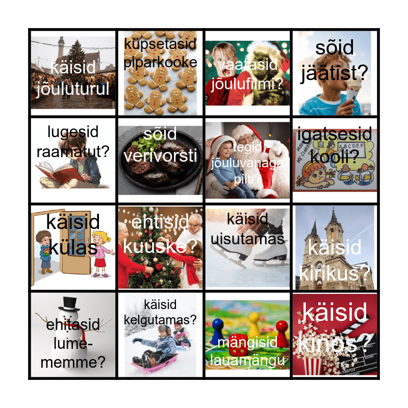 This bingo card has 16 images and 16 words: ehitasid lume-memme?, käisid kelgutamas?, vaatasid jõulufilmi?, sõid jäätist?, lugesid raamatut?, küpsetasid piparkooke, käisid uisutamas, käisid kirikus?, käisid jõuluturul, sõid verivorsti, mängisid lauamängu, igatsesid kooli?, käisid külas, ehtisid kuuske?, tegid jõuluvanaga pilti? and käisid kinos?.