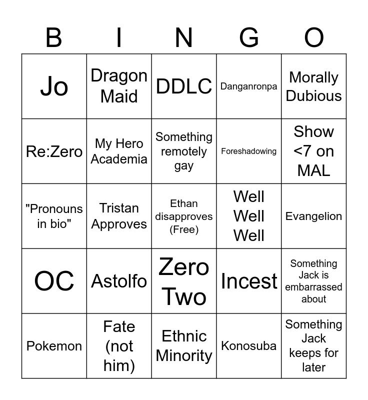 This bingo card has a free space and 24 words: Astolfo, Fate (not him), Something remotely gay, Pokemon, Morally Dubious, Jo, Re:Zero, Dragon Maid, Well Well Well, Zero Two, Foreshadowing, "Pronouns in bio", Incest, Something Jack is embarrassed about, My Hero Academia, Konosuba, Evangelion, DDLC, Show <7 on MAL, Tristan Approves, Something Jack keeps for later, OC, Danganronpa and Ethnic Minority.
