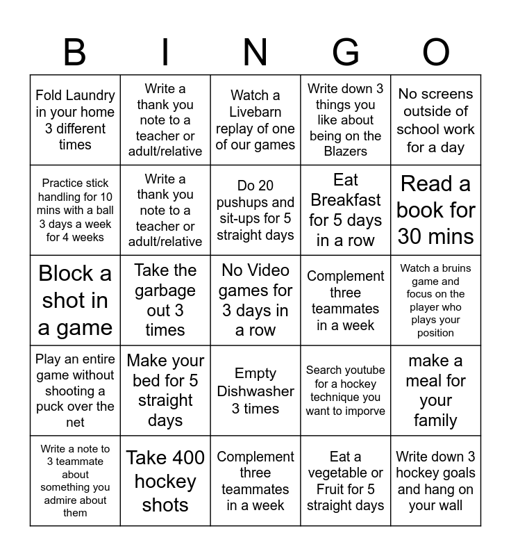 This bingo card has a free space and 24 words: Make your bed for 5 straight days, Take 400 hockey shots, Do 20 pushups and sit-ups for 5 straight days, Write a note to 3 teammate about something you admire about them, No screens outside of school work for a day, Fold Laundry in your home 3 different times, Practice stick handling for 10 mins with a ball 3 days a week for 4 weeks, Write a thank you note to a teacher or adult/relative, Complement three teammates in a week, Empty Dishwasher 3 times, Eat Breakfast for 5 days in a row, Block a shot in a game, Search youtube for a hockey technique you want to imporve, make a meal for your family, Write a thank you note to a teacher or adult/relative, Eat a vegetable or Fruit for 5 straight days, Watch a bruins game and focus on the player who plays your position, Watch a Livebarn replay of one of our games, Read a book for 30 mins, Take the garbage out 3 times, Write down 3 hockey goals and hang on your wall, Play an entire game without shooting a puck over the net, Write down 3 things you like about being on the Blazers and Complement three teammates in a week.