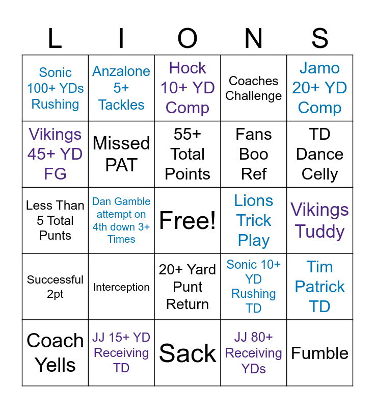 This bingo card has a free space and 39 words: Lions Tuddy, One-Handed Catch, 5+ Total Flag?, Missed PAT, Coach Yells, 20+ Yard Punt Return, 55+ Total Points, Master Bates 45+ YD FG, Jamo 20+ YD Comp, Successful 2pt, Dan Gamble attempt on 4th down 3+ Times, Coaches Challenge, Fumble, Vikings Tuddy, Lions Trick Play, Interception, JJ 20+ YD Comp, Sonic 100+ YDs Rushing, 30+ YD Pass, Sonic 10+ YD Rushing TD, Vikings 45+ YD FG, Sack, Fans Boo Ref, TD Dance Celly, Pick 6, OT, Scoop 6, QB Gets 250+ Passing YDs, 3+ Off Holding Calls, Anzalone 5+ Tackles, DPI Called on a 20+ YD Attempt, Sun God 15+ YD Comp, Hock 10+ YD Comp, JJ 15+ YD Receiving TD, JJ 80+ Receiving YDs, LaPorta 10+ YD Comp, Tim Patrick TD, Less Than 5 Total Punts and Aaron Jones 10+ YD Rushing TD.