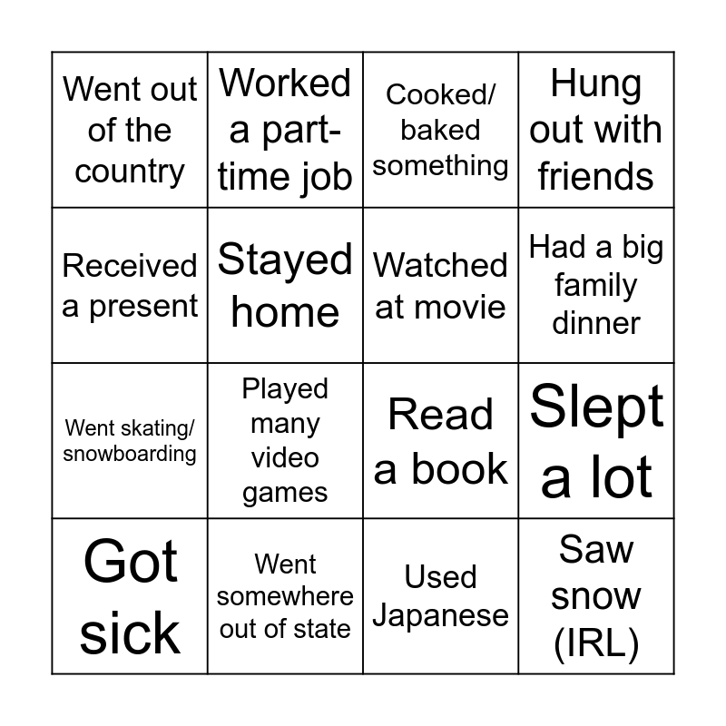 This bingo card has 16 words: Went somewhere out of state, Slept a lot, Cooked/ baked something, Went out of the country, Went skating/ snowboarding, Worked a part-time job, Read a book, Used Japanese, Received a present, Stayed home, Got sick, Hung out with friends, Played many video games, Had a big family dinner, Watched at movie and Saw snow (IRL).