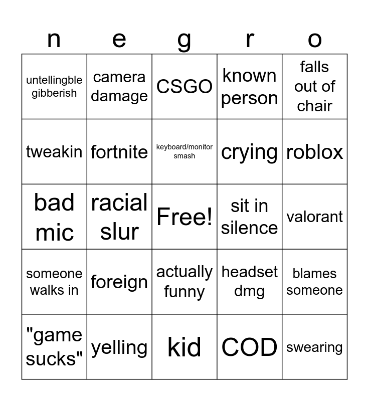 This bingo card has a free space and 24 words: foreign, yelling, keyboard/monitor smash, "game sucks", falls out of chair, untellingble gibberish, tweakin, camera damage, sit in silence, actually funny, crying, bad mic, headset dmg, blames someone, fortnite, COD, valorant, CSGO, roblox, racial slur, swearing, someone walks in, known person and kid.