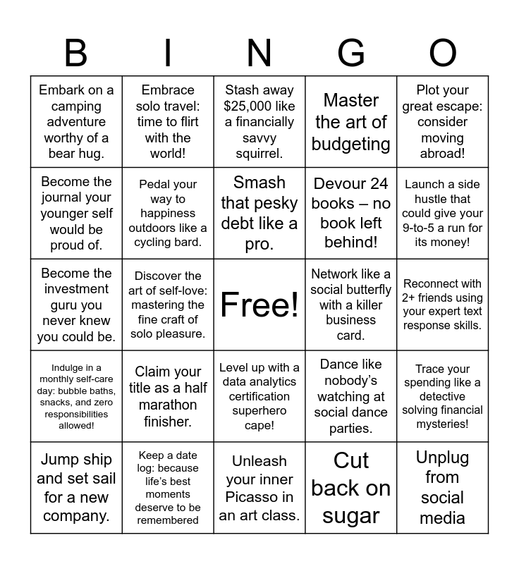 This bingo card has a free space and 25 words: Claim your title as a half marathon finisher., Unleash your inner Picasso in an art class., Smash that pesky debt like a pro., Jump ship and set sail for a new company., Plot your great escape: consider moving abroad!, Embark on a camping adventure worthy of a bear hug., Become the journal your younger self would be proud of., Embrace solo travel: time to flirt with the world!, Network like a social butterfly with a killer business card., Level up with a data analytics certification superhero cape!, Devour 24 books – no book left behind!, Become the investment guru you never knew you could be., Dance like nobody’s watching at social dance parties., Trace your spending like a detective solving financial mysteries!, Pedal your way to happiness outdoors like a cycling bard., Spend quality time with family: it's like a sitcom but real., Reconnect with 2+ friends using your expert text response skills., Stash away $25,000 like a financially savvy squirrel., Launch a side hustle that could give your 9-to-5 a run for its money!, Discover the art of self-love: mastering the fine craft of solo pleasure., Unplug from social media, Keep a date log: because life’s best moments deserve to be remembered, Indulge in a monthly self-care day: bubble baths, snacks, and zero responsibilities allowed!, Master the art of budgeting and Cut back on sugar.