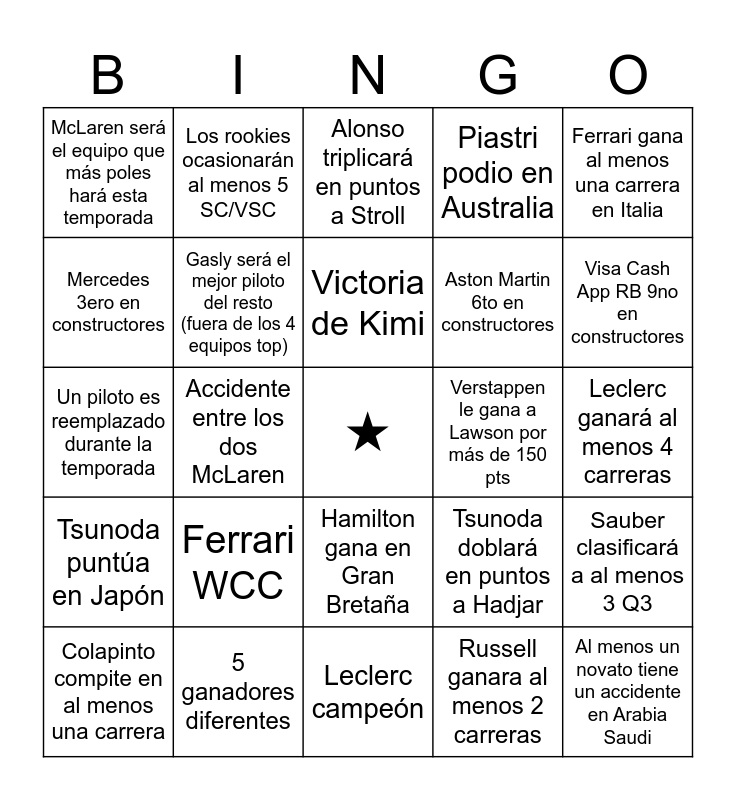 This bingo card has a free space and 24 words: Ferrari WCC, 5 ganadores diferentes, Victoria de Kimi, Colapinto compite en al menos una carrera, Ferrari gana al menos una carrera en Italia, McLaren será el equipo que más poles hará esta temporada, Mercedes 3ero en constructores, Los rookies ocasionarán al menos 5 SC/VSC, Verstappen le gana a Lawson por más de 150 pts, Hamilton gana en Gran Bretaña, Aston Martin 6to en constructores, Un piloto es reemplazado durante la temporada, Tsunoda doblará en puntos a Hadjar, Sauber clasificará a al menos 3 Q3, Gasly será el mejor piloto del resto (fuera de los 4 equipos top), Russell ganara al menos 2 carreras, Leclerc ganará al menos 4 carreras, Alonso triplicará en puntos a Stroll, Visa Cash App RB 9no en constructores, Accidente entre los dos McLaren, Al menos un novato tiene un accidente en Arabia Saudi, Tsunoda puntúa en Japón, Piastri podio en Australia and Leclerc campeón.