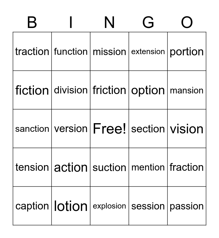 This bingo card has a free space and 24 words: action, lotion, friction, caption, portion, traction, fiction, function, section, suction, option, sanction, mention, fraction, division, session, vision, mission, mansion, version, passion, tension, extension and explosion.
