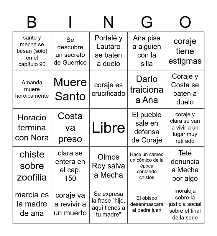 This bingo card has a free space and 24 words: clara se entera en el cap. 150, coraje va a revivir a un muerto, coraje es crucificado, marcia es la madre de ana, coraje tiene estigmas, santo y mecha se besan (solo) en el capítulo 90, Amanda muere heroicamente, Se descubre un secreto de Guerrico, El pueblo sale en defensa de Coraje, Olmos Rey salva a Mecha, Darío traiciona a Ana, Horacio termina con Nora, Hace un cameo un cómico de la época contando chistes, Teté denuncia a Mecha por algo, Muere Santo, El obispo desenmascara al padre juan, coraje y clara se van a vivir a un lugar muy retirado, Portalé y Lautaro se baten a duelo, Coraje y Costa se baten a duelo, Costa va preso, moraleja sobre la justicia social sobre el final de la serie, chiste sobre zoofilia, Ana pisa a alguien con la silla and Se expresa la frase "hijo, aquí tienes a tu madre".