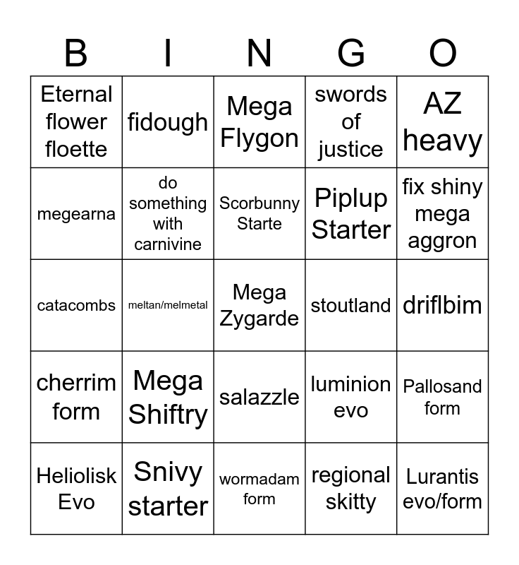 This bingo card has a free space and 24 words: Mega Shiftry, Snivy starter, Scorbunny Starte, Heliolisk Evo, AZ heavy, Eternal flower floette, megearna, fidough, stoutland, salazzle, Piplup Starter, catacombs, luminion evo, Pallosand form, do something with carnivine, regional skitty, driflbim, Mega Flygon, fix shiny mega aggron, meltan/melmetal, Lurantis evo/form, cherrim form, swords of justice and wormadam form.