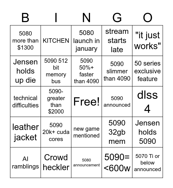 This bingo card has a free space and 24 words: AI ramblings, 5090 20k+ cuda cores, 5090 50%+ faster than 4090, 5090=<600w, "it just works", 5080 more than $1300, KITCHEN, 5080 launch in january, 5090 announced, dlss 4, technical difficulties, 5090 512 bit memory bus, 5090 32gb mem, Jensen holds 5090, Jensen holds up die, Crowd heckler, 5080 announcement, stream starts late, 50 series exclusive feature, leather jacket, 5090-greater than $2000, new game mentioned, 5090 slimmer than 4090 and 5070 Ti or below announced.