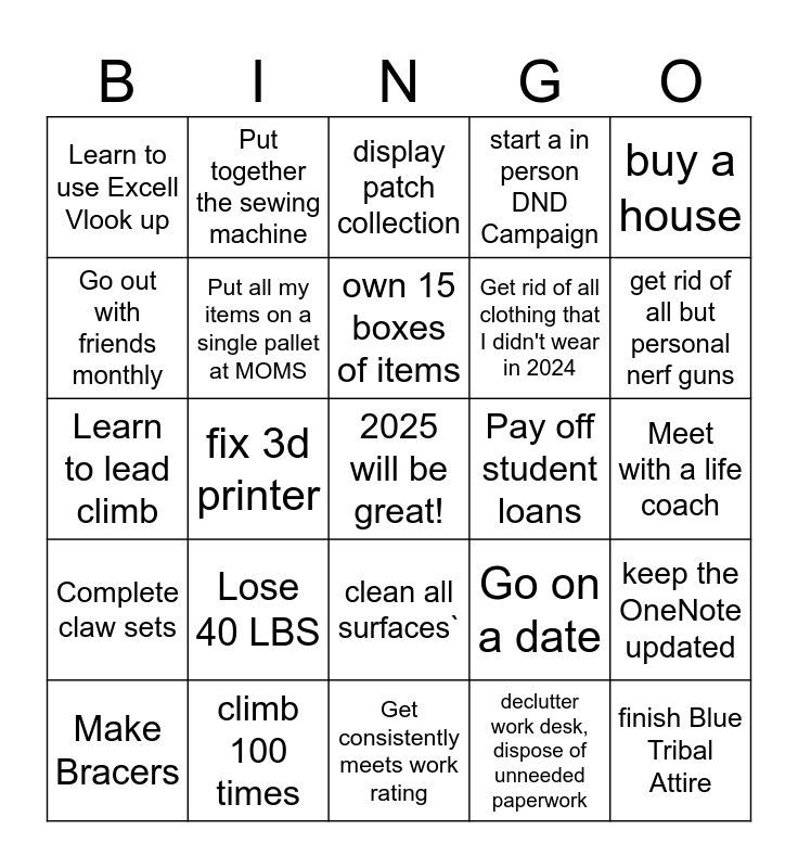 This bingo card has a free space and 24 words: Lose 40 LBS, climb 100 times, own 15 boxes of items, Make Bracers, buy a house, Learn to use Excell Vlook up, Go out with friends monthly, Put together the sewing machine, Pay off student loans, clean all surfaces`, Get rid of all clothing that I didn't wear in 2024, Learn to lead climb, Go on a date, keep the OneNote updated, Put all my items on a single pallet at MOMS, declutter work desk, dispose of unneeded paperwork, Meet with a life coach, display patch collection, get rid of all but personal nerf guns, fix 3d printer, finish Blue Tribal Attire, Complete claw sets, start a in person DND Campaign and Get consistently meets work rating.