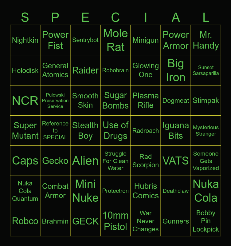 This bingo card has 49 words: Deathclaw, Big Iron, War Never Changes, Reference to SPECIAL, Smooth Skin, Mysterious Stranger, Power Fist, GECK, Power Armor, Struggle For Clean Water, Mr. Handy, Mole Rat, Dogmeat, Plasma Rifle, Combat Armor, Iguana Bits, Holodisk, Sunset Sarsaparilla, Nuka Cola, Minigun, Glowing One, Stealth Boy, Nightkin, General Atomics, Robco, Raider, Stimpak, Brahmin, Sugar Bombs, Pulowski Preservation Service, Bobby Pin Lockpick, Radroach, Nuka Cola Quantum, Mini Nuke, Super Mutant, Rad Scorpion, VATS, Someone Gets Vaporized, NCR, Alien, Protectron, Caps, Use of Drugs, 10mm Pistol, Robobrain, Sentrybot, Hubris Comics, Gecko and Gunners.