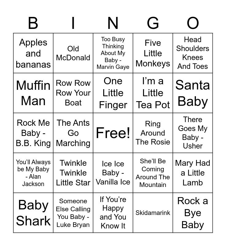 This bingo card has a free space and 46 words: You Are My Sunshine, Rock a Bye Baby, Itsy Bitsy Spider, If You’re Happy and You Know It, Twinkle Twinkle Little Star, Wheels On The Bus, Old McDonald, Baa Baa Black Sheep, Muffin Man, Fruit Salad, Row Row Row Your Boat, Five Little Monkeys, Mary Had a Little Lamb, She’ll Be Coming Around The Mountain, London Bridge Is Falling Down, Finger Family, One Little Finger, Ring Around The Rosie, Bingo, Head Shoulders Knees And Toes, The Ants Go Marching, Skidamarink, Apples and bananas, I’m a Little Tea Pot, Baby - Justin Bieber, Santa Baby, Baby Shark, Hit Me Baby One More Time, Ice Ice Baby - Vanilla Ice, You’ll Always be My Baby - Alan Jackson, Baby Love - The Supremes, Runaway Baby - Bruno Mars, Baby Baby Baby - TLC, Baby Got Back - Sir Mix a Aot, Baby I Would - Dillion Carmichael, Someone Else Calling You Baby - Luke Bryan, There Goes My Baby - Usher, Baby It’s Cold Outside, Baby Girl - Sugar Land, Baby Be Mine - Michael Jackson, When She Says Baby - Jason Aldean, Too Busy Thinking About My Baby - Marvin Gaye, Rock Me Baby - B.B. King, Baby I - Arianna Grande, Baby I Love You - Big Mountain and I Got You Babe - Sonny and Cher.