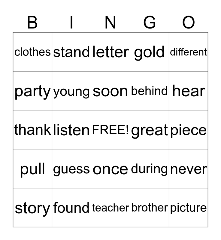 This bingo card has a free space and 25 words: guess, teacher, soon, story, different, clothes, party, stand, great, once, behind, thank, during, never, young, ago, piece, letter, hear, listen, picture, found, pull, gold and brother.