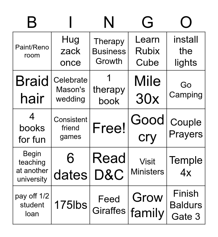 This bingo card has a free space and 24 words: 6 dates, 175lbs, 1 therapy book, pay off 1/2 student loan, install the lights, Paint/Reno room, Braid hair, Hug zack once, Good cry, Read D&C, Mile 30x, 4 books for fun, Visit Ministers, Temple 4x, Celebrate Mason's wedding, Grow family, Couple Prayers, Therapy Business Growth, Go Camping, Consistent friend games, Finish Baldurs Gate 3, Begin teaching at another university, Learn Rubix Cube and Feed Giraffes.
