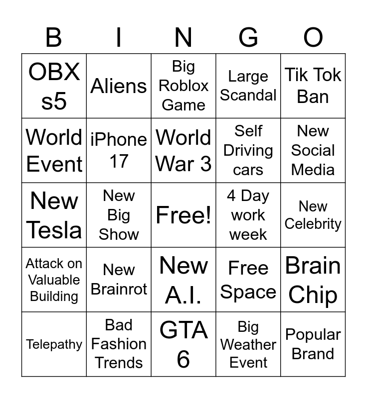 This bingo card has a free space and 25 words: New Brainrot, GTA 6, World War 3, Telepathy, Tik Tok Ban, OBX s5, World Event, Aliens, 4 Day work week, New A.I., Self Driving cars, New Tesla, Free Space, Brain Chip, iPhone 17, New Big Movie, New Celebrity, Big Roblox Game, New Social Media, New Big Show, Popular Brand, Bad Fashion Trends, Attack on Valuable Building, Large Scandal and Big Weather Event.