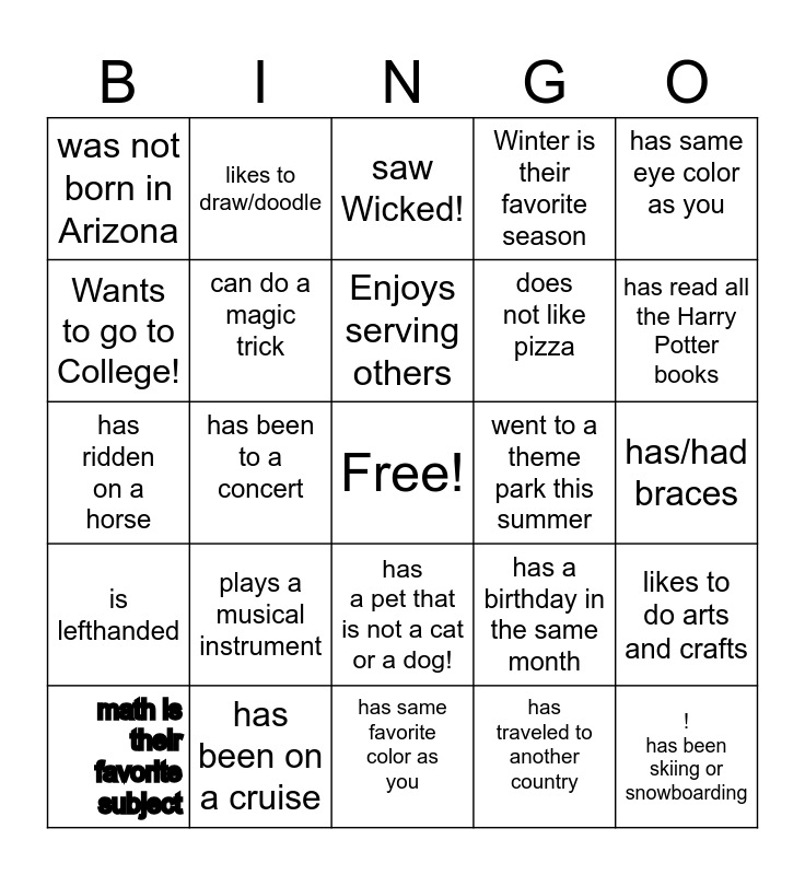 This bingo card has a free space and 29 words: math is their favorite subject, does not like pizza, has been to a concert, is wearing green, was not born in Arizona, saw Wicked!, can do a magic trick, plays a musical instrument, went to a theme park this summer, has been on a cruise, has/had braces, ! has been skiing or snowboarding, has same favorite color as you, has traveled to another country, has read all the Harry Potter books, likes to cook, has a pet that is not a cat or a dog!, is lefthanded, has same eye color as you, has ridden on a horse, has a birthday in the same month, has a sibling at GPA, does not like pizza, Wants to go to College!, Winter is their favorite season, likes to draw/doodle, likes to do arts and crafts, Enjoys serving others and Likes activity days!.