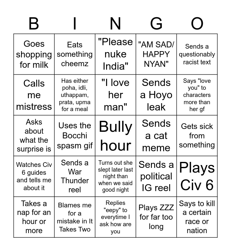 This bingo card has a free space and 24 words: Sends a War Thunder reel, Blames me for a mistake in It Takes Two, "I love her man", Takes a nap for an hour or more, Sends a questionably racist text, Goes shopping for milk, Calls me mistress, Eats something cheemz, Sends a cat meme, Turns out she slept later last night than when we said good night, Sends a Hoyo leak, Asks about what the surprise is, Sends a political IG reel, Plays Civ 6, Has either poha, idli, uthappam, prata, upma for a meal, Plays ZZZ for far too long, Gets sick from something, "Please nuke India", Says "love you" to characters more than her gf, Uses the Bocchi spasm gif, Says to kill a certain race or nation, Watches Civ 6 guides and tells me about it, "AM SAD/ HAPPY NYAN" and Replies "eepy" to everytime I ask how are you.