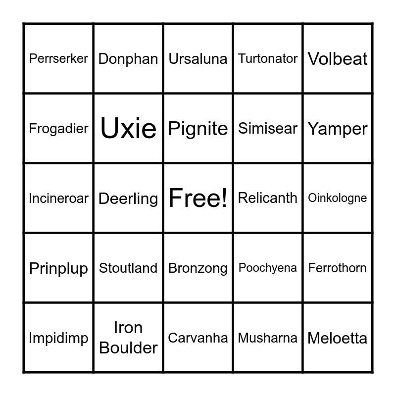 This bingo card has a free space and 318 words: Venomoth, Kadabra, Machoke, Machamp, Rapidash, Marowak, Lickitung, Rhyhorn, Seaking, Scyther, Jynx, Tauros, Aerodactyl, Articuno, Zapdos, Moltres, Meganium, Quilava, Noctowl, Ledian, Ariados, Yanma, Ursaring, Magcargo, Octillery, Mantine, Phanpy, Donphan, Stantler, Raikou, Entei, Swampert, Poochyena, Wurmple, Beautifly, Lombre, Nuzleaf, Shiftry, Taillow, Vigoroth, Slaking, Loudred, Exploud, Hariyama, Medicham, Manectric, Volbeat, Illumise, Swalot, Carvanha, Sharpedo, Numel, Camerupt, Torkoal, Cacnea, Solrock, Claydol, Anorith, Armaldo, Glalie, Sealeo, Walrein, Relicanth, Regirock, Registeel, Kyogre, Groudon, Deoxys, Infernape, Prinplup, Starly, Staravia, Staraptor, Kricketune, Luxio, Rampardos, Bastiodon, Floatzel, Purugly, Skuntank, Bronzong, Gible, Gabite, Hippowdon, Skorupi, Toxicroak, Carnivine, Lumineon, Mantyke, Abomasnow, Magnezone, Lickilicky, Rhyperior, Magmortar, Togekiss, Yanmega, Mamoswine, Probopass, Uxie, Mesprit, Azelf, Heatran, Cresselia, Arceus, Servine, Serperior, Pignite, Emboar, Dewott, Samurott, Watchog, Stoutland, Liepard, Simisage, Simisear, Simipour, Musharna, Tranquill, Blitzle, Zebstrika, Gurdurr, Conkeldurr, Palpitoad, Basculin, Krookodile, Darumaka, Tirtouga, Carracosta, Gothitelle, Swanna, Deerling, Sawsbuck, Karrablast, Jellicent, Galvantula, Ferrothorn, Beheeyem, Fraxure, Haxorus, Shelmet, Accelgor, Mienshao, Bisharp, Braviary, Mandibuzz, Durant, Zweilous, Larvesta, Volcarona, Cobalion, Terrakion, Virizion, Thundurus, Landorus, Meloetta, Genesect, Chesnaught, Braixen, Delphox, Frogadier, Fletchling, Fletchinder, Talonflame, Vivillon, Pyroar, Floette, Florges, Skiddo, Gogoat, Pangoro, Honedge, Doublade, Aromatisse, Barbaracle, Clauncher, Clawitzer, Gourgeist, Avalugg, Noibat, Hoopa, Volcanion, Dartrix, Torracat, Incineroar, Trumbeak, Gumshoos, Vikavolt, Crabominable, Wishiwashi, Araquanid, Shiinotic, Steenee, Oranguru, Passimian, Komala, Turtonator, Togedemaru, Hakamo-o, Kommo-o, Tapu Koko, Tapu Lele, Tapu Bulu, Cosmog, Cosmoem, Lunala, Buzzwole, Pheromosa, Kartana, Necrozma, Magearna, Poipole, Naganadel, Zeraora, Melmetal, Rillaboom, Skwovet, Greedent, Blipbug, Dottler, Orbeetle, Eldegoss, Drednaw, Yamper, Boltund, Flapple, Silicobra, Sandaconda, Arrokuda, Barraskewda, Centiskorch, Clobbopus, Grapploct, Polteageist, Hattrem, Impidimp, Morgrem, Perrserker, Mr. Rime, Alcremie, Pincurchin, Frosmoth, Stonjourner, Indeedee, Morpeko, Cufant, Copperajah, Zacian, Zamazenta, Urshifu, Zarude, Regieleki, Regidrago, Glastrier, Spectrier, Calyrex, Kleavor, Ursaluna, Basculegion, Sneasler, Overqwil, Enamorus, Crocalor, Skeledirge, Quaxwell, Quaquaval, Oinkologne, Spidops, Pawmo, Pawmot, Dachsbun, Arboliva, Squawkabilly, Naclstack, Garganacl, Armarouge, Ceruledge, Wattrel, Mabosstiff, Grafaiai, Toedscruel, Klawf, Scovillain, Rabsca, Espathra, Revavroom, Glimmora, Cetitan, Dondozo, Annihilape, Clodsire, Kingambit, Great Tusk, Brute Bonnet, Flutter Mane, Slither Wing, Sandy Shocks, Iron Bundle, Iron Hands, Iron Jugulis, Iron Thorns, Arctibax, Baxcalibur, Chien-Pao, Ting-Lu, Chi-Yu, Roaring Moon, Iron Valiant, Walking Wake, Iron Leaves, Sinistcha, Okidogi, Fezandipiti, Archaludon, Gouging Fire, Raging Bolt, Iron Boulder, Iron Crown and Pecharunt.