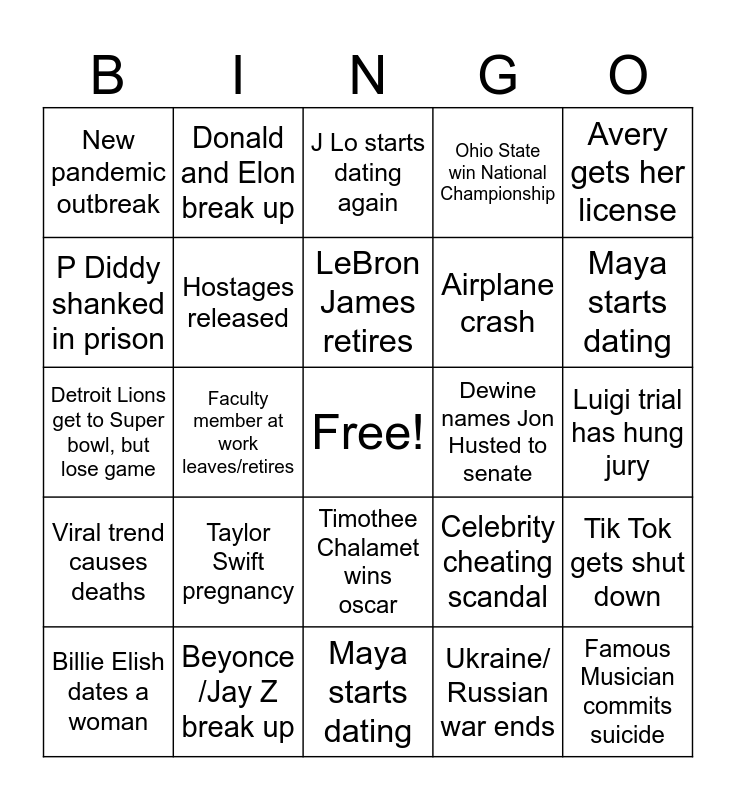 This bingo card has a free space and 24 words: Taylor Swift pregnancy, Beyonce /Jay Z break up, LeBron James retires, Billie Elish dates a woman, Avery gets her license, New pandemic outbreak, P Diddy shanked in prison, Donald and Elon break up, Dewine names Jon Husted to senate, Timothee Chalamet wins oscar, Airplane crash, Detroit Lions get to Super bowl, but lose game, Celebrity cheating scandal, Tik Tok gets shut down, Hostages released, Ukraine/ Russian war ends, Luigi trial has hung jury, J Lo starts dating again, Maya starts dating, Faculty member at work leaves/retires, Famous Musician commits suicide, Viral trend causes deaths, Ohio State win National Championship and Maya starts dating.