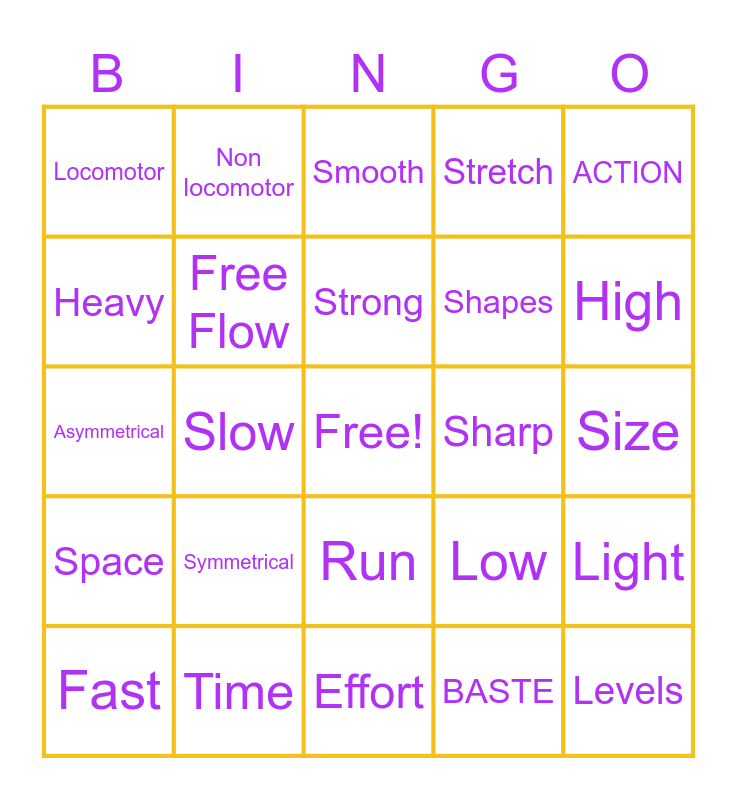 This bingo card has a free space and 25 words: Space, Time, Effort, BASTE, ACTION, Locomotor, Non locomotor, Smooth, Sharp, Light, Heavy, Free Flow, Bound Flow, Low, High, Fast, Slow, Strong, Shapes, Size, Asymmetrical, Symmetrical, Run, Stretch and Levels.
