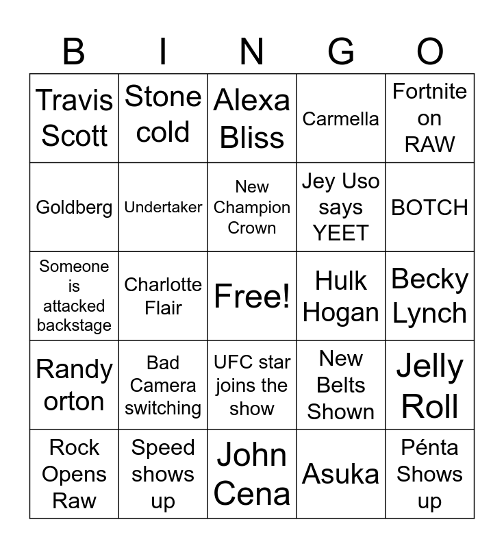 This bingo card has a free space and 24 words: Rock Opens Raw, Bad Camera switching, New Champion Crown, Asuka, Fortnite on RAW, Travis Scott, Stone cold, Alexa Bliss, Hulk Hogan, Becky Lynch, Someone is attacked backstage, Undertaker, New Belts Shown, Jelly Roll, Goldberg, Speed shows up, John Cena, Carmella, BOTCH, Randy orton, Charlotte Flair, UFC star joins the show, Jey Uso says YEET and Pénta Shows up.