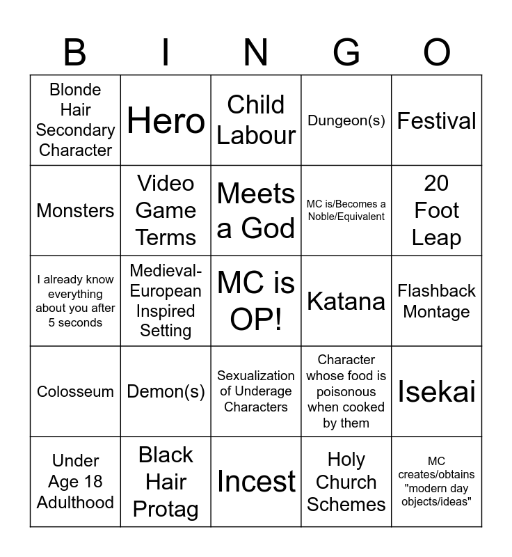 This bingo card has a free space and 29 words: Under Age 18 Adulthood, Has Childhood Friend (Crush), Medieval-European Inspired Setting, Child(ren) Fighting Battle/War(s), Blonde Hair Secondary Character, Child Labour, Video Game Terms, Demon(s), Katana, Black Hair Protag, Flashback Montage, MC creates/obtains "modern day objects/ideas", Incest, Holy Church Schemes, 20 Foot Leap, MC is a Good Cook, Sexualization of Underage Characters, Colosseum, Festival, I already know everything about you after 5 seconds, Character whose food is poisonous when cooked by them, Demi-Humans, MC is/Becomes a Noble/Equivalent, Monsters, Dungeon(s), Hero, Isekai, Meets a God and Painful Misunderstanding.