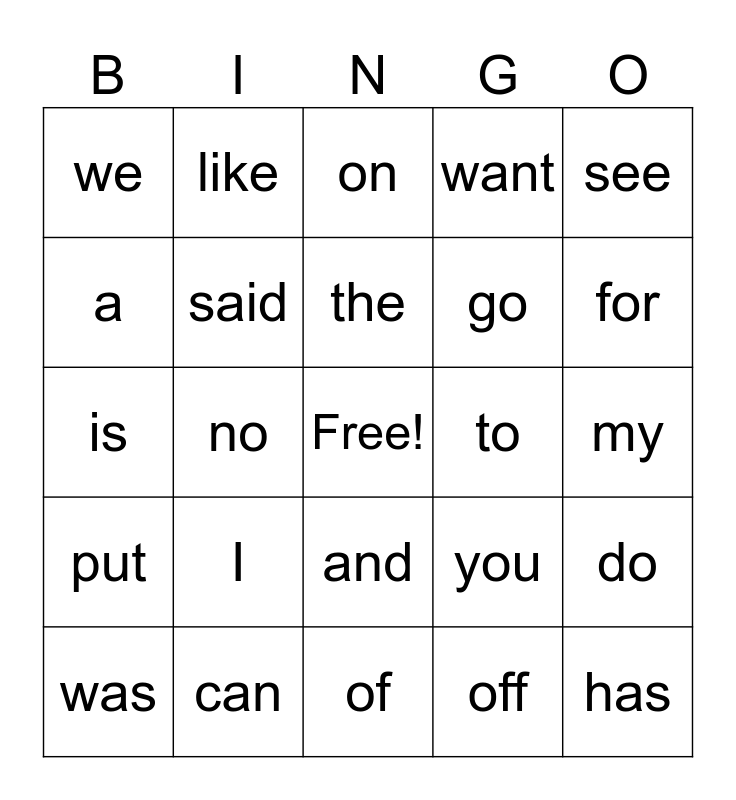 This bingo card has a free space and 24 words: I, can, the, was, see, we, a, like, to, and, go, is, you, do, said, off, my, on, for, no, has, put, want and of.
