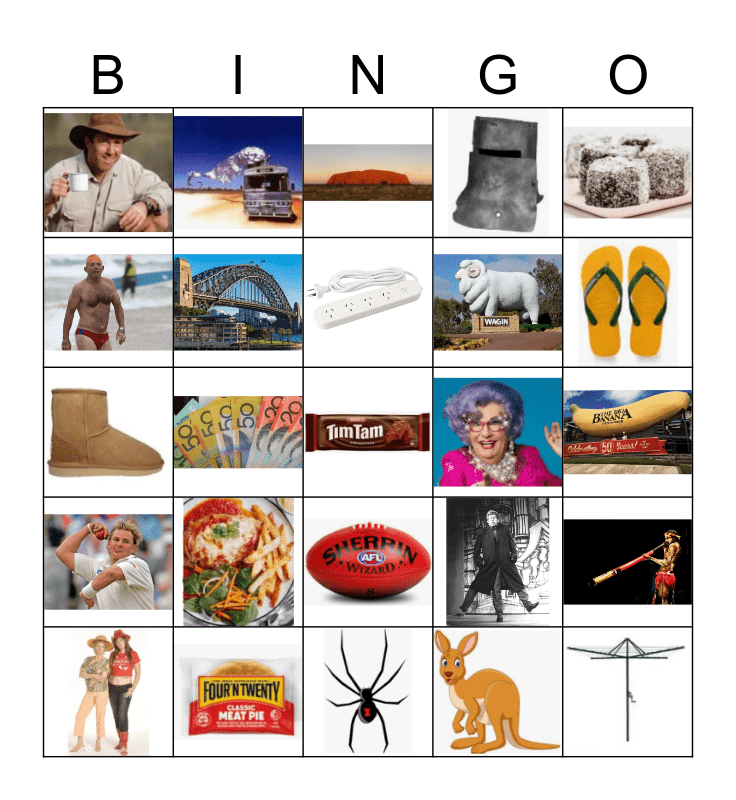 This bingo card has 43 images, a free space and 1 words: AUSSIE.