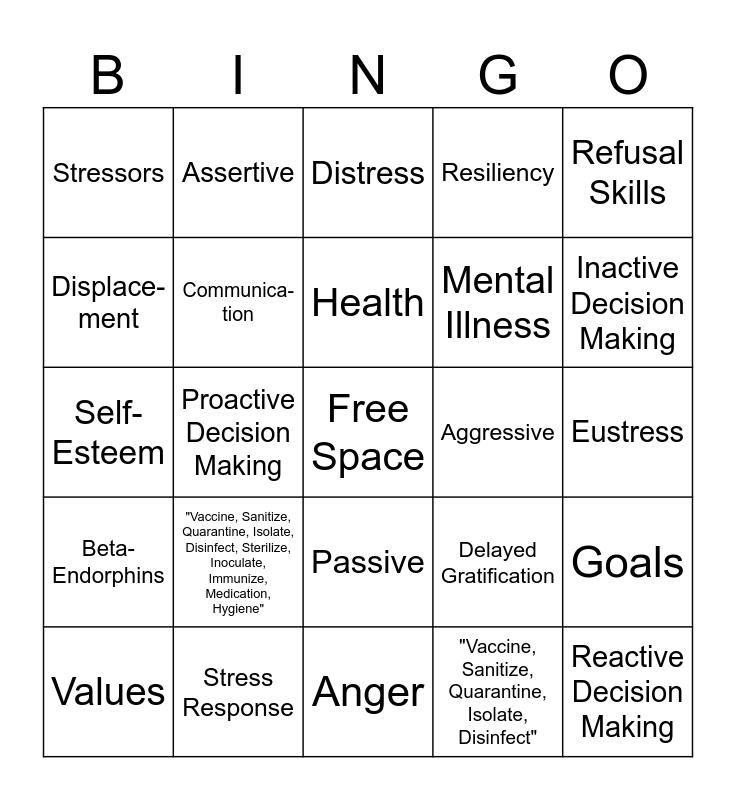 This bingo card has a free space and 25 words: "Vaccine, Sanitize, Quarantine, Isolate, Disinfect, Sterilize, Inoculate, Immunize, Medication, Hygiene", Anger, Health, Values, Refusal Skills, Stressors, Displace- ment, Assertive, Aggressive, Passive, Mental Illness, Self-Esteem, Delayed Gratification, Goals, Communica-tion, Listening skills, Eustress, Distress, Inactive Decision Making, Proactive Decision Making, Reactive Decision Making, Stress Response, Beta- Endorphins, Resiliency and "Vaccine, Sanitize, Quarantine, Isolate, Disinfect".