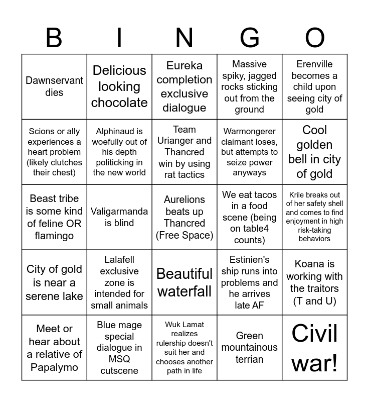 This bingo card has a free space and 24 words: Lalafell exclusive zone is intended for small animals, Blue mage special dialogue in MSQ cutscene, Team Urianger and Thancred win by using rat tactics, Meet or hear about a relative of Papalymo, Erenville becomes a child upon seeing city of gold, Dawnservant dies, Scions or ally experiences a heart problem (likely clutches their chest), Delicious looking chocolate, We eat tacos in a food scene (being on table4 counts), Beautiful waterfall, Warmongerer claimant loses, but attempts to seize power anyways, Beast tribe is some kind of feline OR flamingo, Estinien's ship runs into problems and he arrives late AF, Koana is working with the traitors (T and U), Alphinaud is woefully out of his depth politicking in the new world, Green mountainous terrian, Krile breaks out of her safety shell and comes to find enjoyment in high risk-taking behaviors, Eureka completion exclusive dialogue, Cool golden bell in city of gold, Valigarmanda is blind, Civil war!, City of gold is near a serene lake, Massive spiky, jagged rocks sticking out from the ground and Wuk Lamat realizes rulership doesn't suit her and chooses another path in life.